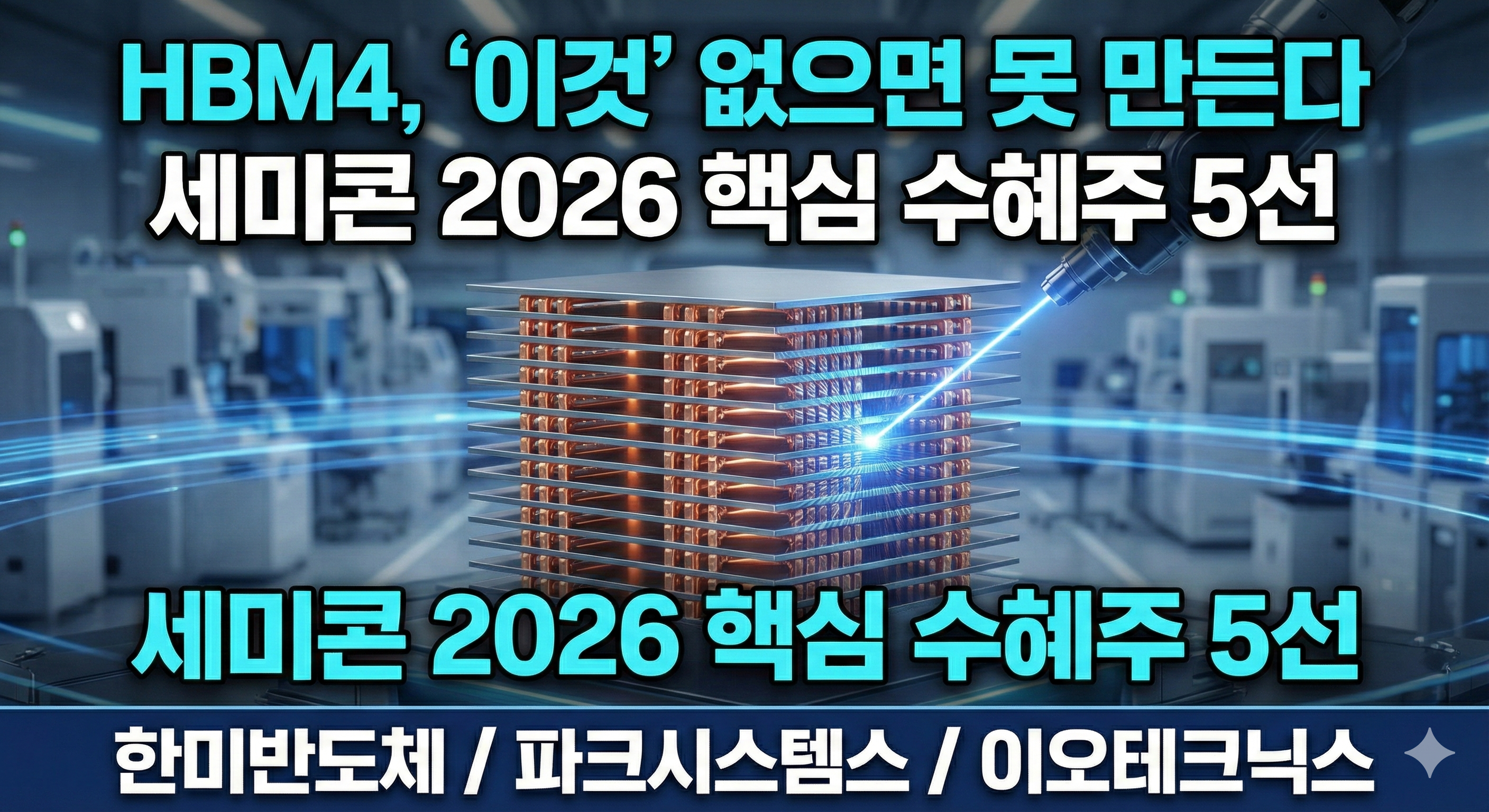 - HBM4 포인트: HBM4용 웨이퍼는 종잇장처럼 얇습니다. 칼날로 자르면 다 깨지기 때문에 레이저 장비의 중요성이 2026년에 더욱 폭발합니다. 어닐링(열처리) 장비 수요도 함께 늘고 있습니다.
